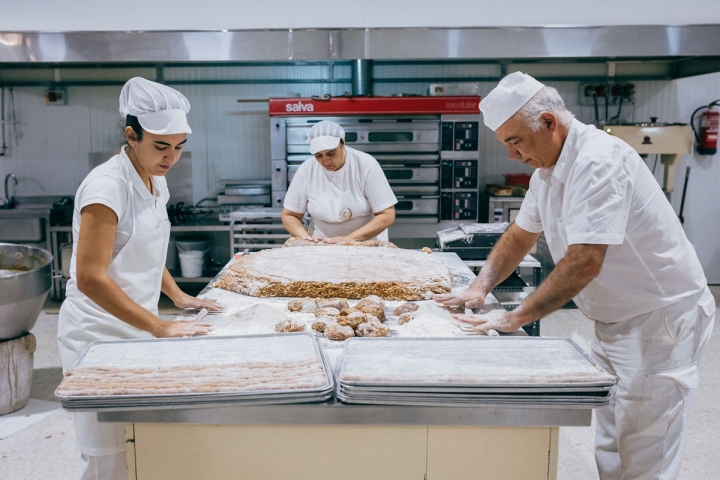La oferta es similar en versión repostera. Impresiona ver, desde el mirador elevado, la fabril y febril producción de las operarias de blanco impoluto. Las grandes dimensiones dan para reservar la primera planta a eventos y celebraciones. Mientras, seis empleadas se afanan en ofrecer amarguillos, alfajores, tortas pardas, mantecados, roscos de vino, bolas de coco y chocolate, mazapanes. Todo vuela ante una cola que, gracias a la amplitud del complejo, permite acoger una ordenada fila de más de 30 metros.