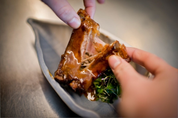 Ahora sí, es el turno de servir las carnes. Dependiendo del menú, ofrecen carrilleras de cerdo con salsa de miel, canela y whisky de Bourbon con maíz quemado, cebolla dulce y mostaza; o solomillo de cerdo ibérico marcado a la plancha, granos de mostaza y una crujiente mazorca encurtida. "Todas nuestras carnes las traemos de Otero, un carnicero de la zona que trabaja muy bien. En sus granjas elegimos los mejores corderos y cerdos", dice Carlos mientras revela que su intención es conseguir que la mayor parte de los productos de su carta sean de la comarca. "Queremos que Talavera nos alimente", recalca.