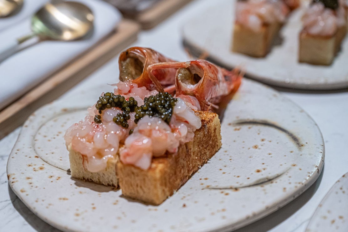 La campana de mantequilla es la excusa para razonar la herencia francesa del camino que Erauzkin ha recorrido hasta llegar aquí: “Mi cocina es de mi abuela, pero también de todo lo que he ido recogiendo estos años aquí y allá… De lo que he vivido, nunca pisé una escuela de cocina…”. Y de ese resumen vital está hecho su menú sorpresa que se lleva a la mesa al unísono —“quien no llegue a la hora empezará por el pase que toque, esto es como una función”, avisa—. No habría que fallar mirando la manecilla para no perderse el primer snack, una liviana seta del castanyer, que crece en árboles caídos y se usa sobre todo para sopas: “Yo la compro seca, la hidrato en caldo de chipirón, la vuelvo a secar y la frío”. La sirve acompañada de mayonesa de gochujang (dulce y picante) y le acompaña un mochi de queso brie trufado tapado por dos generosas láminas de trufa. Normalmente sería una elaboración dulce, pero Erauzkin tiene debilidad por incorporar el dulce en los pases salados y el salado en los postres.