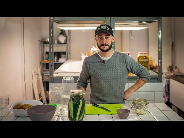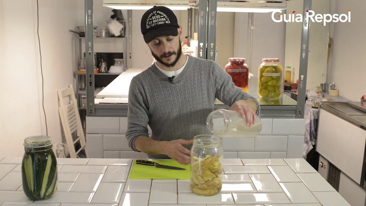 Añadimos la salmuera en nuestro bote hasta cubrir los pepinos. Por encima ponemos los ajos, la pimienta, las mostazas y dos pimientos habaneros (si no tenéis habaneros podéis utilizar guindilla seca o similar). Cubrimos todo con la hoja de parra para que le aporte los taninos (se puede sustituir por hoja de té o alguna planta que tenga taninos, aunque si no tienes no es necesaria.
