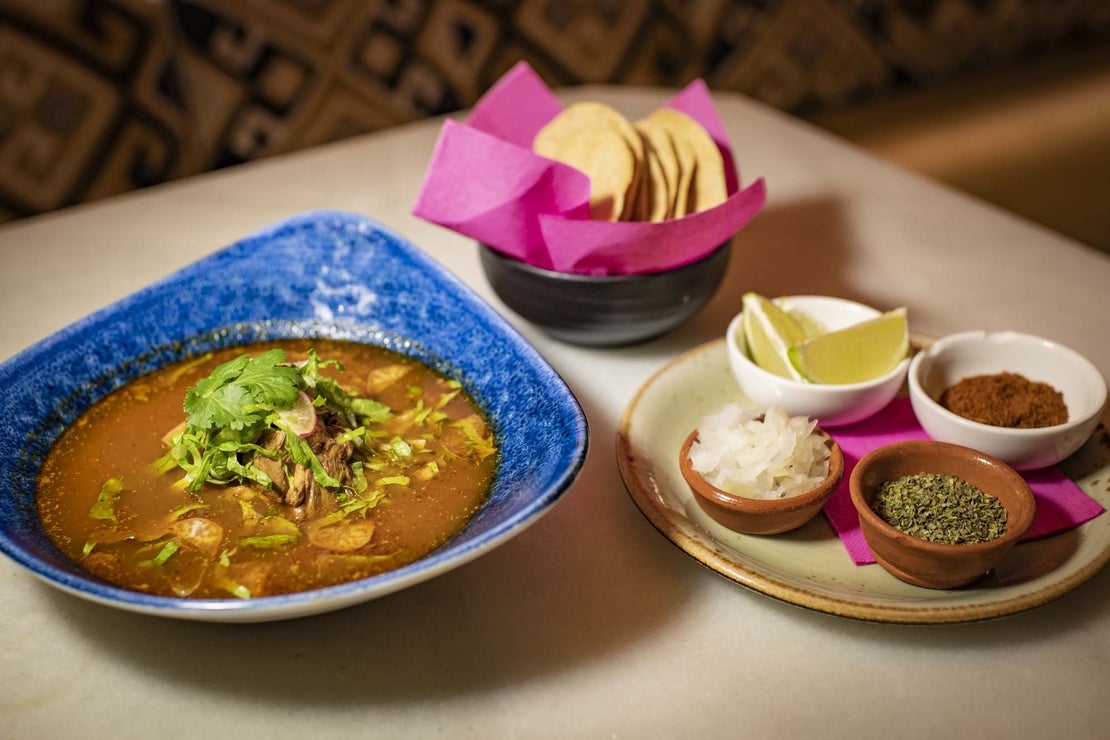 Añadimos el caldo del guiso y acompañamos con el resto de la guarnición: lima, orégano, chile piquín (para los que quieren que pique de verdad), rabanitos y tostadas de maíz fritas.