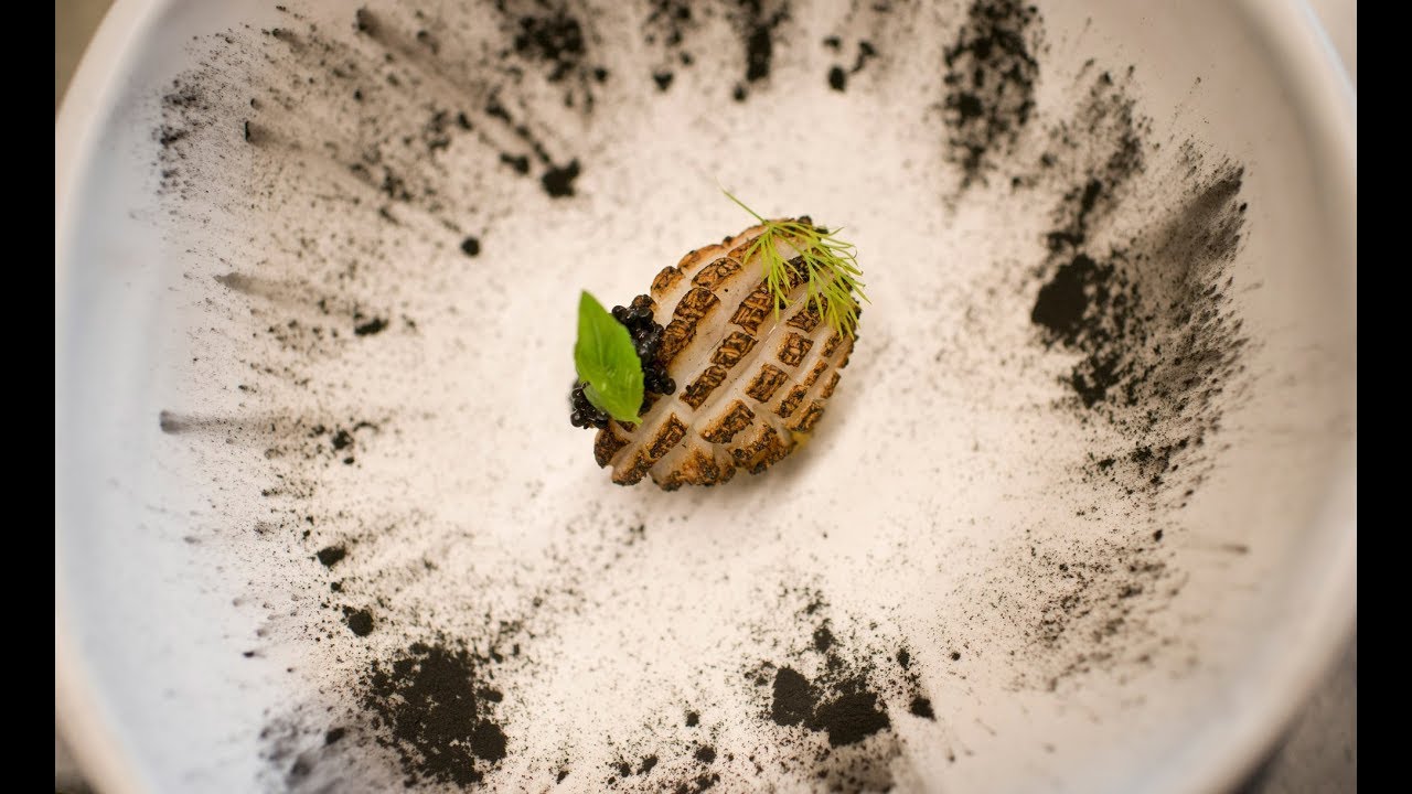 Comenzamos con una tapa muy manchega, muy de la casa. La vamos a confitar con abundante grasa, en aceite de oliva virgen extra, junto a pieles de naranja y ajo, durante 12-14 horas. La papada confitada es magia, es pura mantequilla. La servimos con un cremoso de queso manchego que podéis hacer también en casa, y un pan artesano de tomillo y romero. Para presentarlo, lo vamos a poner en una parrilla, con leña. Y lo quemamos con el soplete, para que parezca que se ha hecho a la brasa, con olor a campo. Acompañamos con los ajos enteros.