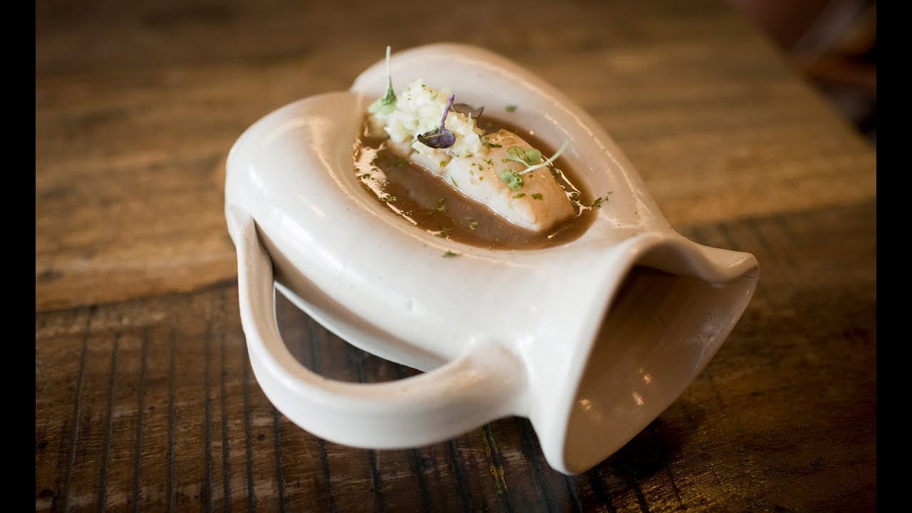 9. Unta con queso manchego crema una rebanada de pan de tomillo y napa la carne con el jugo reducido de la papada.