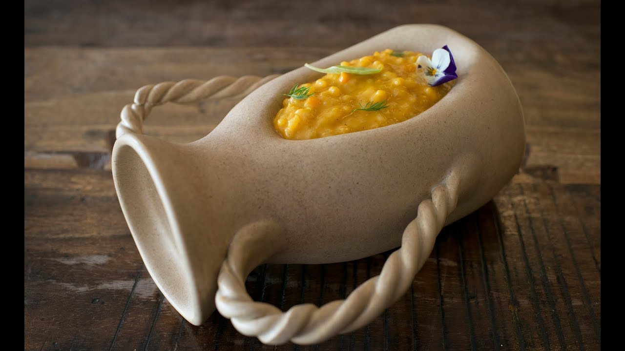 Empezaremos añadiendo la crema de calabaza asada poco a poco, cuando se nos haya agotado, el arroz continuará duro y tendremos que seguir añadiendo el caldo de verduras (se añade siempre caliente y seguimos removiendo).