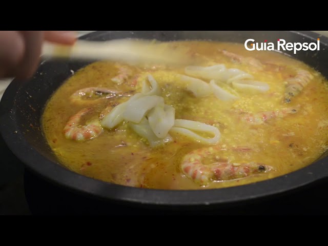 Añadir el arroz, subir el fuego, sofreír y echar el caldo bien caliente con el contenido del mortero. Colocar el calamar y los mariscos y mejillones en orden, probar la sal y añadir más si es necesario.