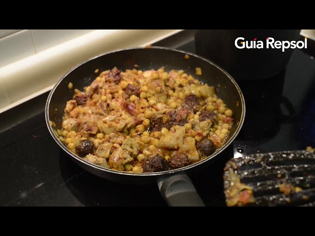 En una cazuela de barro plana calentar el aceite y sofreír los ajos pelados. Retirar al mortero y echar la cebolla, varios ajos sin pelar y luego el tomate picado. Seguidamente sofreír las patatas. Echar un poco de pimentón en un lado de la cazuela junto con las morcillas, los garbanzos, las carnes reservadas en trozos chicos y remojar con el caldo.