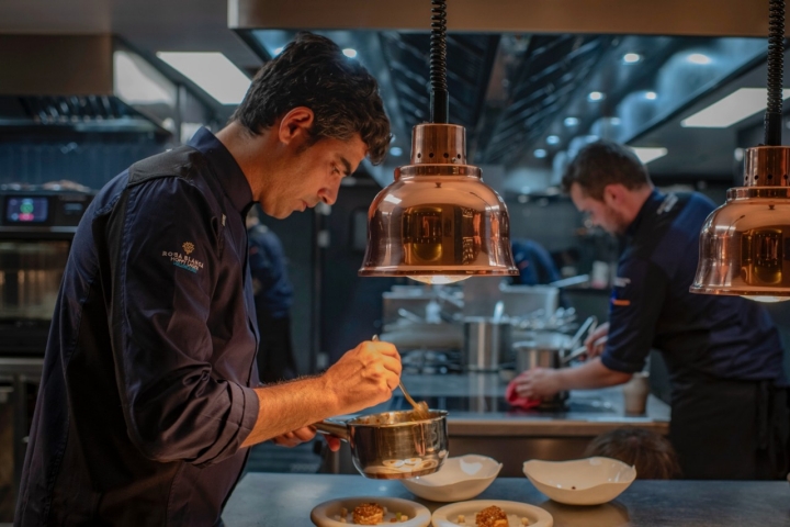 Su apuesta por los productos de kilómetro cero le permiten dar forma a una cocina imaginativa con fuerte identidad balear modelada bajo su personal prisma. Esta temporada, destacan platos como el mejillón de Cala Fornells (Menorca) a la naranja y las mollejas de pato; la galantina de conejo con papada de cerdo negro y pistacho, salsa de guisantes verdes y mostaza, taco de sardina ahumada y un arroz seco de hierba; el calamar de pota con mayonesa de algas y tacos de cecina de cerdo negro; o la codorniz a la melaza rellena de verduras, finas hierbas y sus interiores.