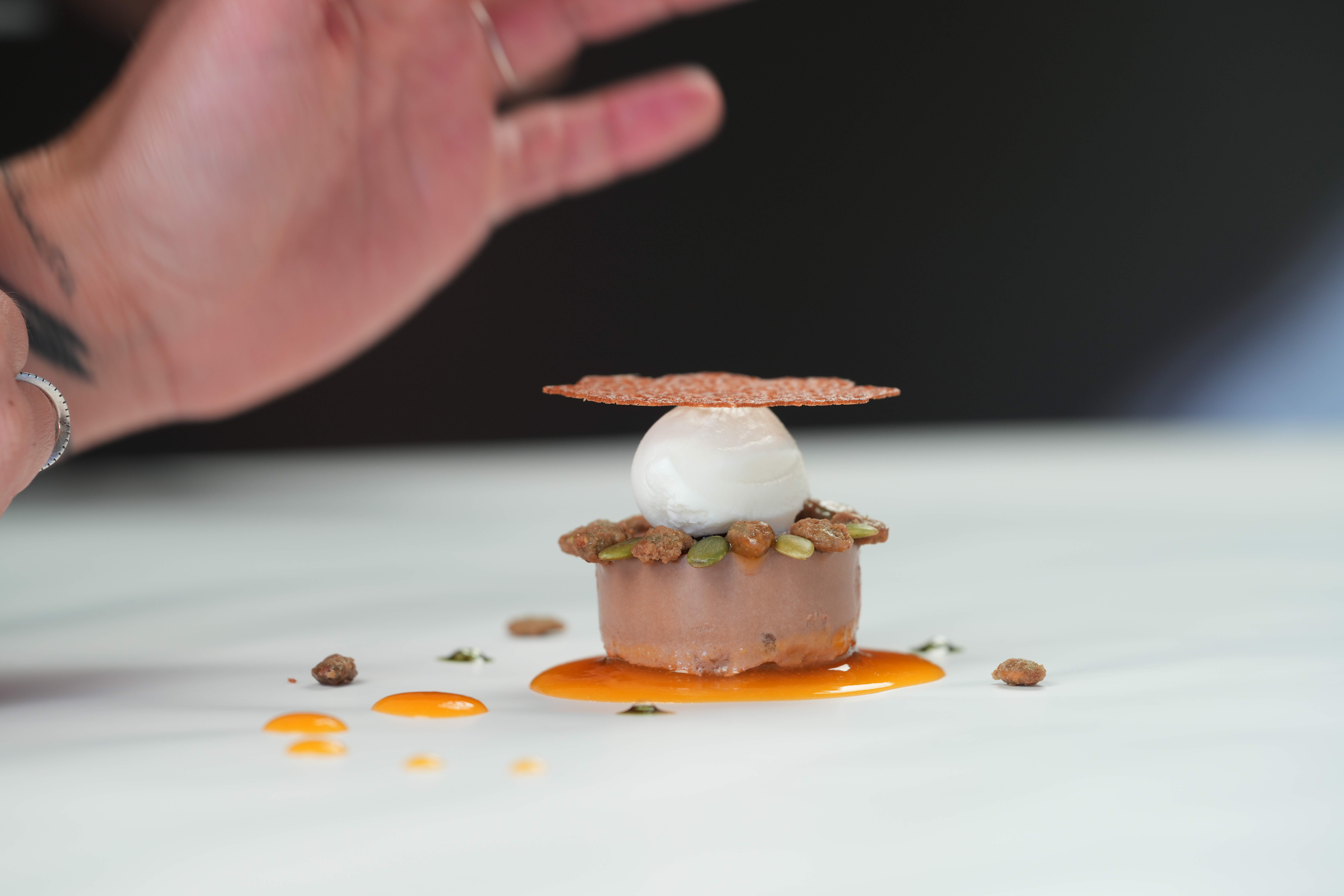 En su propuesta gastronómica, un motor que revitaliza el desarrollo económico local, se da protagonismo siempre al paisaje pirenaico -del río, a la huerta o al bosque- y a los pequeños productores que encontramos en la zona, como la piscifactoría de El Grado. Su cocina sorprende por sus texturas delicadas y su estética moderna y actual, al igual que la decoración interior del restaurante.