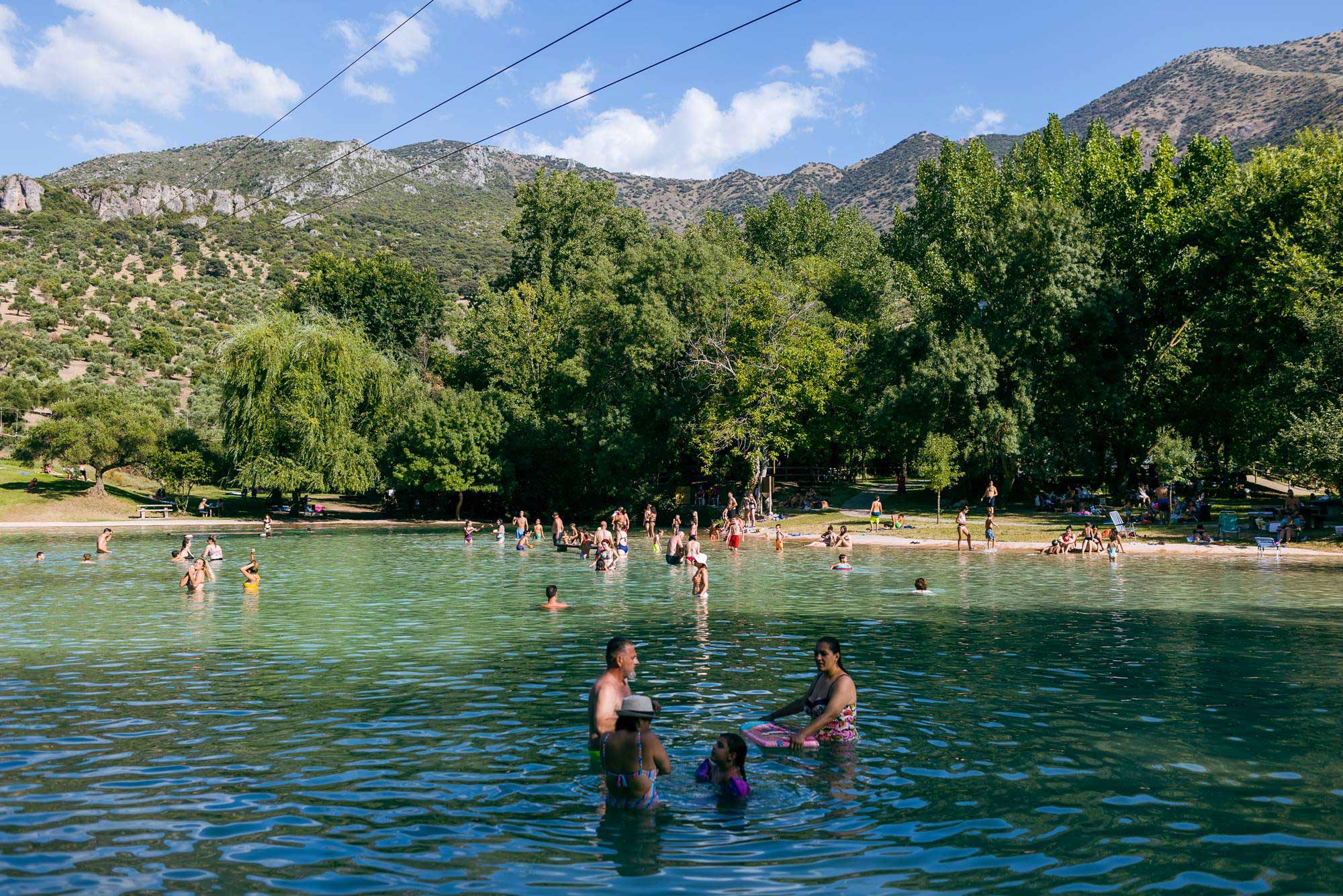 La escasez de cobertura en la zona ayuda a la desconexión y, con ello, la vuelta a la tradición. Sobre el césped hay un grupo de chicas que juega a las cartas, dos mujeres aprovechan para leer y una familia al completo se echa la siesta. Una red para la práctica de voleibol es la diversión de otro grupo de chavales; a escasos metros un padre juega con sus hijos y sobrinos a la petanca. La tarde se va completando con bocadillos de nocilla, sándwich helado y un rato de buceo con la difícil esperanza de encontrar vida marina bajo esta lámina de agua. Hay una zona infantil y otra, más amplia, que apenas cubre salvo en uno de sus extremos, donde el máximo de profundidad llega a dos metros y medio. Es el lugar más tranquilo y el elegido por algún bañista para descansar sobre un colchón inflable.